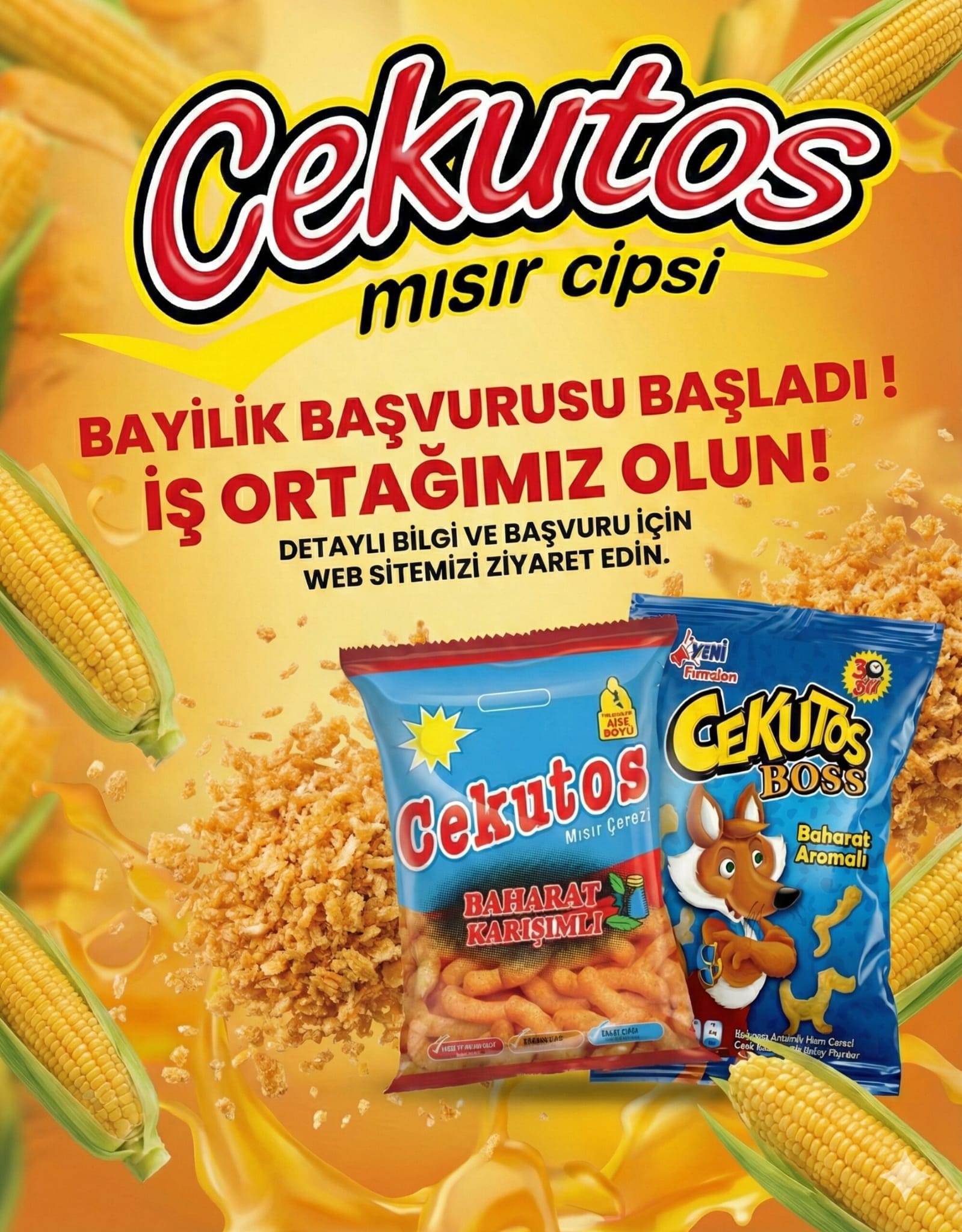 Türkiye’nin dört bir yanına yayılan lezzet ağımızda yerinizi almaya hazır mısınız? Yediden yetmişe herkesin severek tükettiği, doğal ve katkısız mısır çerezi lezzetimiz Cekutos, büyüyen pazar payı ve güçlü dağıtım ağıyla yeni iş ortaklarını arıyor.